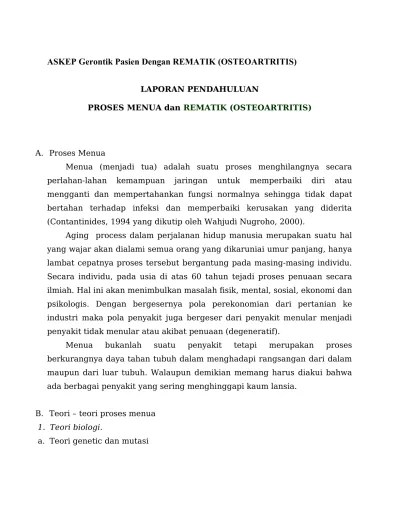 Mengidentifikasi hasil asuhan keperawatan gerontik pada tn. Asuhan keperawatan gerontik pada ny.s dengan rematik (osteoartritis) di perumahan pondok martoloyo kota tegal dosen pembimbing : Rematik adalah orang yang menderita rheumatism (encok), arthritis (radang sendi) yang menyebabkan pembengkakan, (utomo2005). This document was uploaded by user . Bahwa asam urat sama dengan rematik, sebenarnya tidak sama.