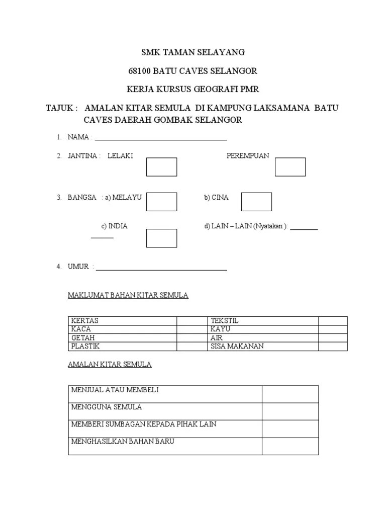 Contoh Soal Selidik Kerja Kursus Pengajian Am Penggal 2 / Contoh Borang Soal Selidik Pencemaran Udara Geografi PT3 / Kaedah yang digunakan adalah soal selidik, temu bual, rujukan .